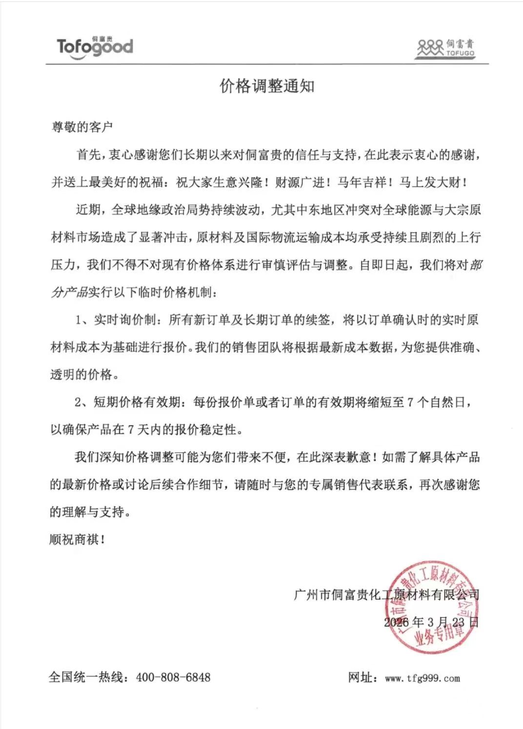 尊敬的客户:首先,衷心感谢大家长期以来对侗富贵的信任与支持!在此,我们致以最诚挚的谢意,并送上最美好的祝福:祝各位生意兴隆、财源广进!马年吉祥、万事顺遂!近期,全球地缘政治局势持续波动,尤其受中东地区冲突影响,全球能源及大宗原材料市场受到显著冲击。原材料价格与国际物流运输成本均承受持续且剧烈的上行压力。基于此,我们不得不对现有价格体系进行审慎评估与调整。自即日起,我们将对部分产品实行以下临时价格机制:1、实时询价制:所有新订单及长期订单的续签,将以订单确认时的实时原材料成本为基础进行报价。我们的销售团队将根据最新成本数据,为您提供准确、透明的价格。2、短期价格有效期:每份报价单或者订单的有效期将缩短至7个自然日,以确保产品在7天内的报价稳定性。我们深知价格调整可能为您们带来不便,在此深表歉意!如需了解具体产品的最新价格或讨论后续合作细节,请随时与您的专属销售代表联系,再次感谢您的理解与支持。顺祝商祺!